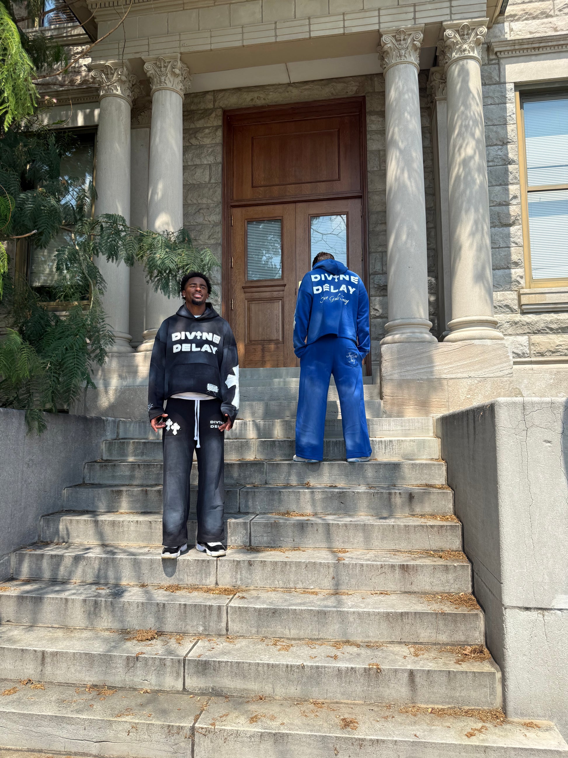 Model in black sweatsuit is 6'4 205 lbs. wearing XL top and Large bottoms